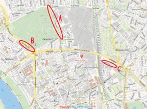 B: Danziger Straße (unter der Hochbrücke) – ca. 70 Parkplätze (ca. 1,3 km Fußweg, 14–17 Minuten)
