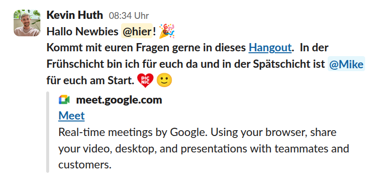 | Schichtbeginn | Die Newbies mit einem Post im Channel #de-cs-shiftcommunication mit dem Link zum Newbie-Hangout einladen. |
