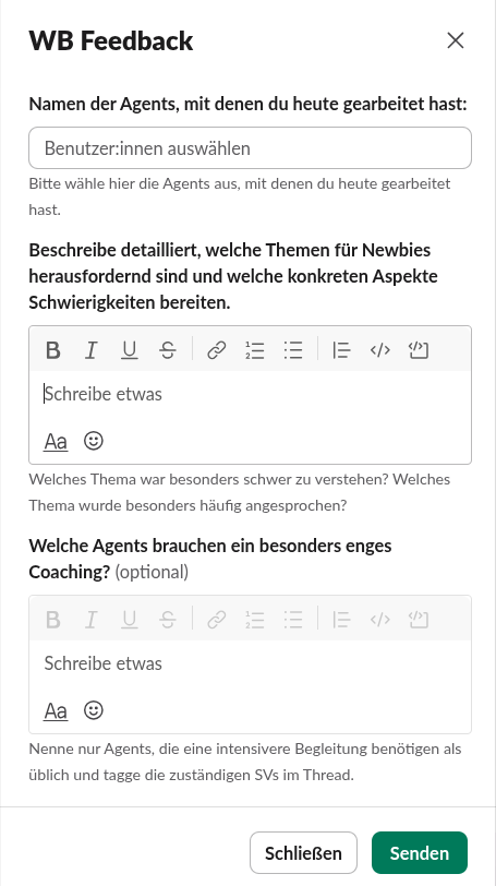 | 4 | Qualitätssicherung: Auch hier gilt: Bei groben Schnitzern bitte direkt konstruktives Feedback an den Junior Agent geben und in den Notizen vermerken. |